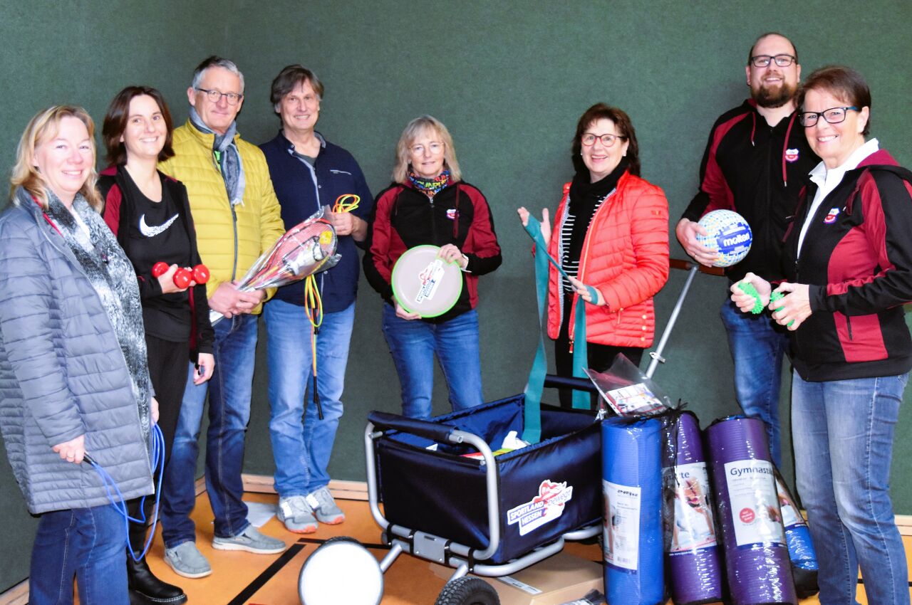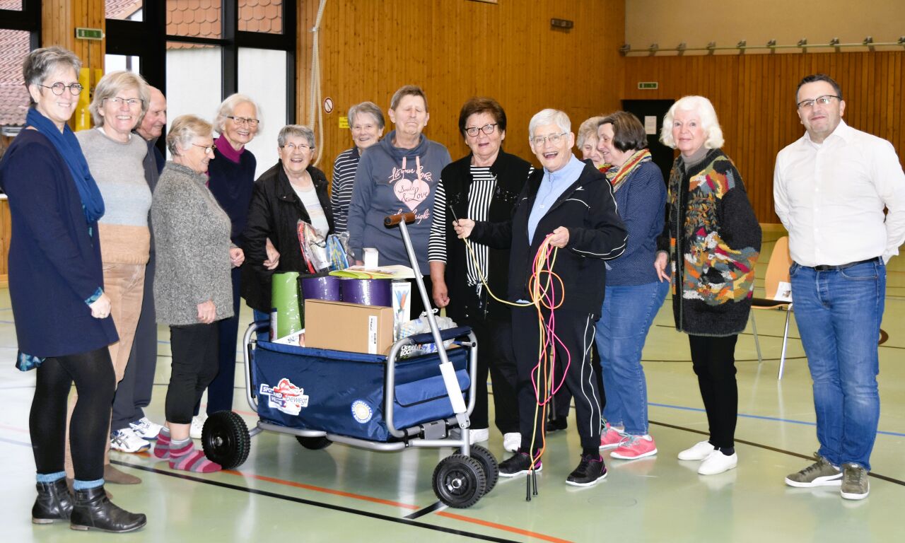 Die Pakete bestehen aus einem robusten sowie klappbaren Bollerwagen mit hochwertiger Bereifung, der mit einer Auswahl verschiedener Sport- und Spielmaterialien ausgestattet ist. „Sie wurden so ausgesucht, dass sich mit ihnen in Kombination mit verschiedenen Stationen ein qualitativ guter Sportkurs im Freien realisieren lässt“, sagte Magdalena Weidner, die Turngau-Vorsitzende. Sie ist Übungsleiterin beim TSV Gertenbach und zeigte auf die Stationskarten des Pakets. Auf diesen Karten werden Übungen zu Kraft, Ausdauer und Koordination einfach erklärt „Man kann direkt losgelegen“, sagte Möller. Der Spaß darf auch nicht zu kurz kommen. Aus diesem Grund beinhaltet der Bollerwagen Sportgeräte wie beispielsweise Crossboccia, Frisbee oder Indiaka. Letzteres ist ein schnelles und sehr dynamisches Rückschlagspiel, welches auf südamerikanische Wurzeln zurückgeführt wird. Das Spiel ist eine Mannschaftssportart, die – ähnlich wie Volleyball – auf einem durch ein Netz getrenntes Spielfeld gespielt wird.