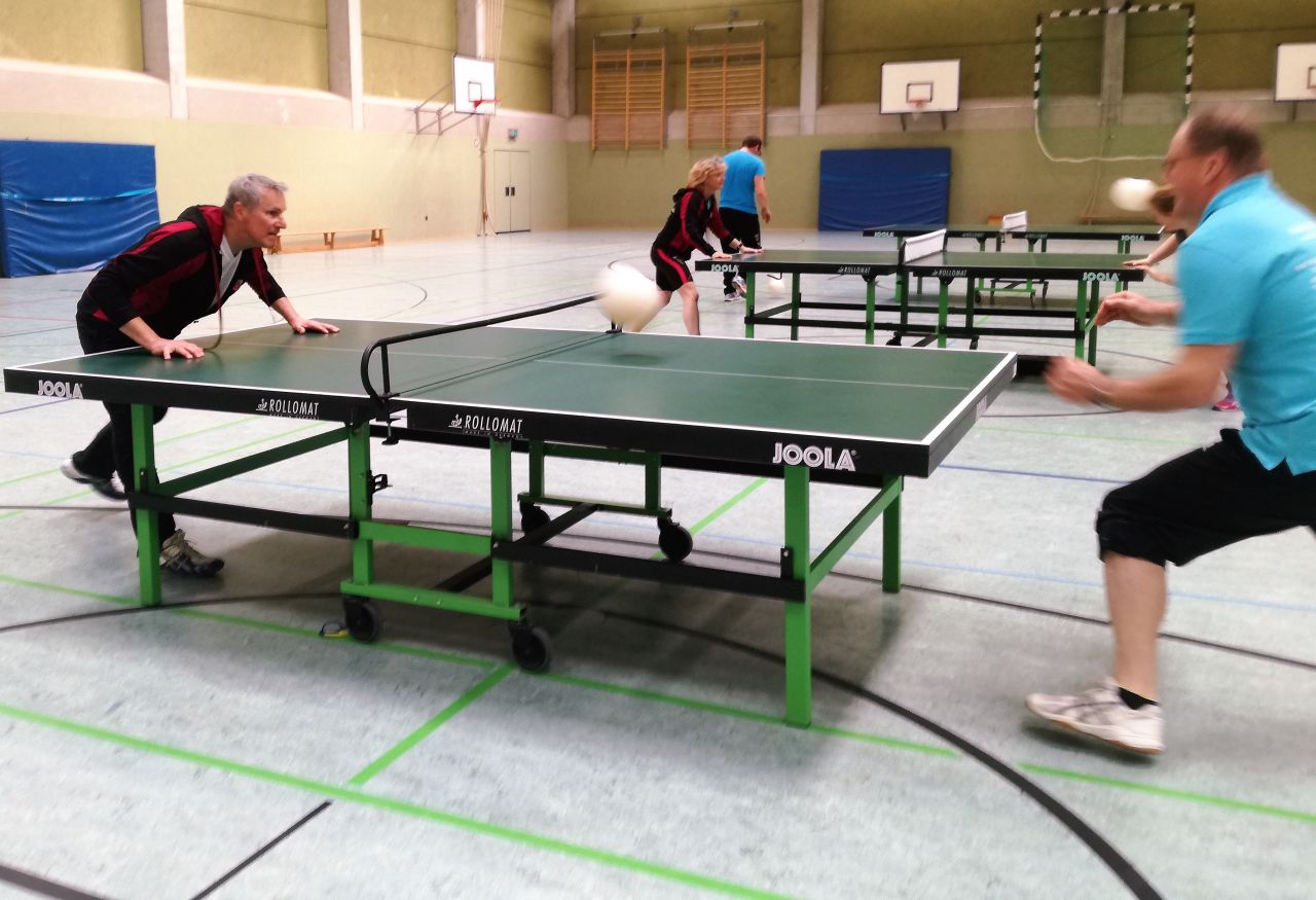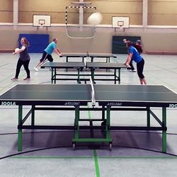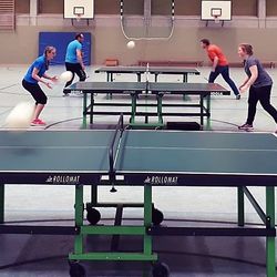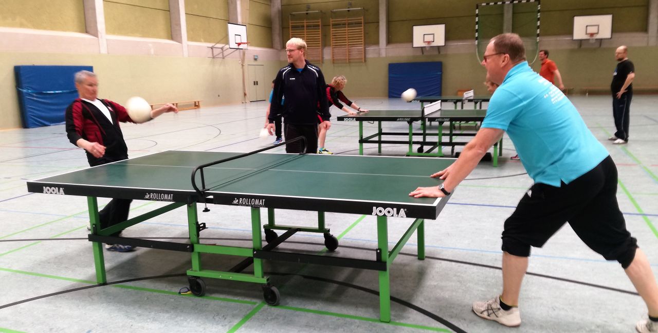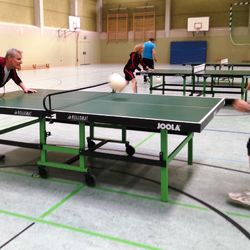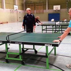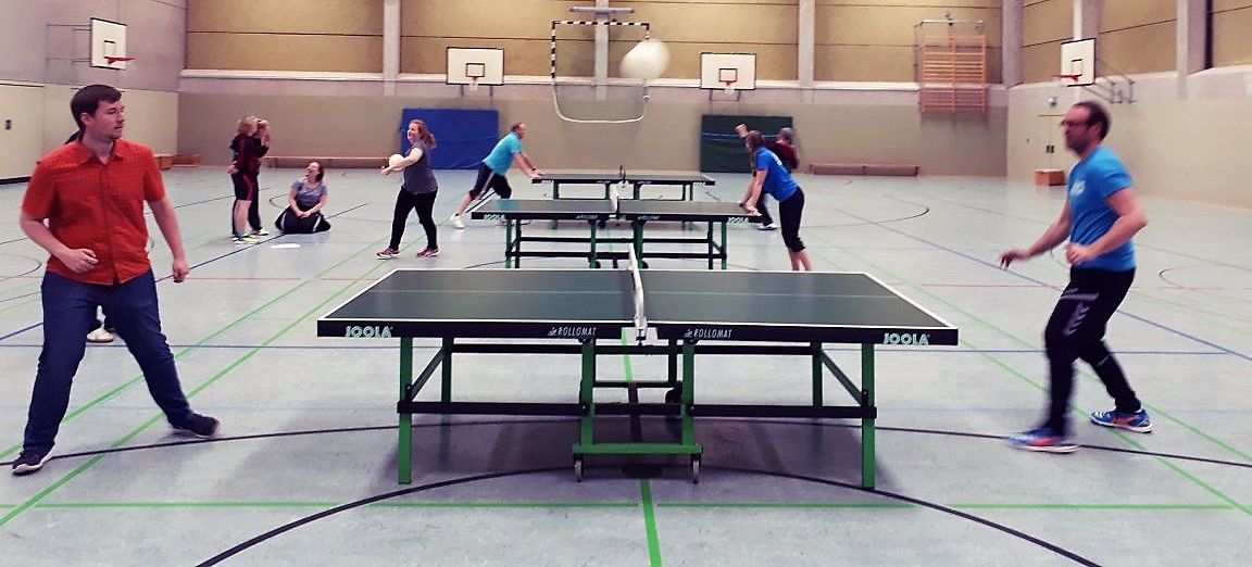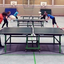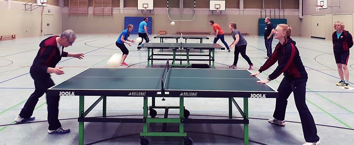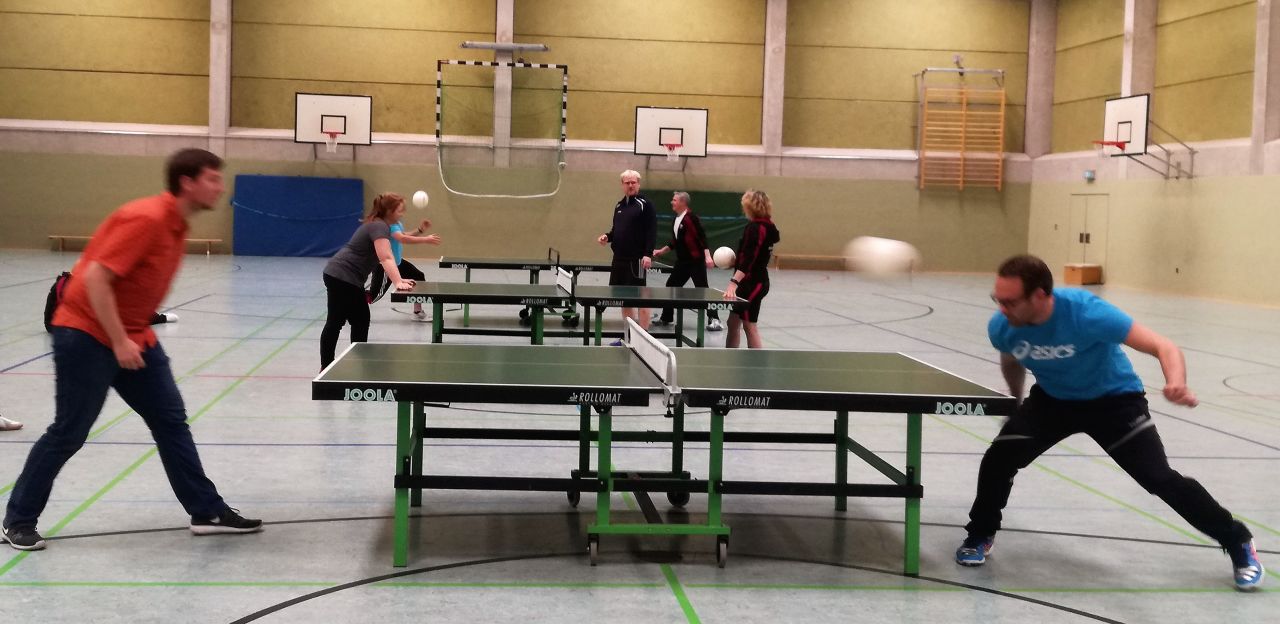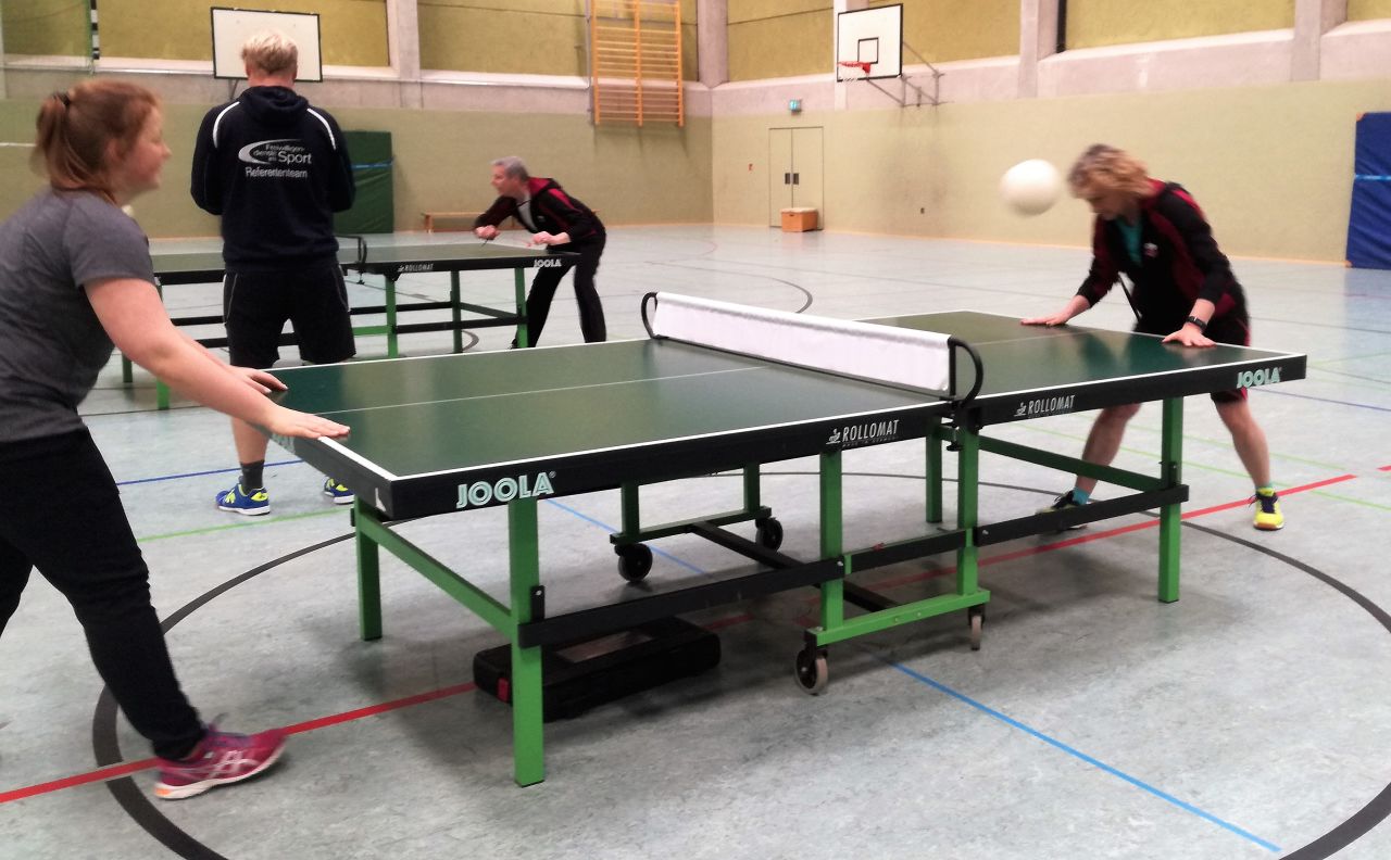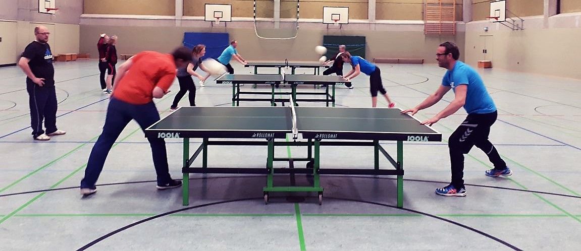 Headis? Noch nie gehört oder gehört, aber noch nicht ausprobiert? Dann geht es Ihnen genauso wie den Teilnehmern der Fortbildung. Headis ist eine Art Kopfballtischtennis. Gespielt wird auf einer normalen Tischtennisplatte mit Metallnetz und einem handballgroßen, aber sehr leichten und weichen Ball. Die Grundregeln sind wie beim Tischtenis. Allerdings gibt es einige Ausnahmen, z.B. darf man beim Headis auf de Platte springen um einen Ball noch köpfen zu können. Nach einigen Versuchen den Ball mit dem Kopf zu treffen, klappten die ersten Ballwechsel und es wurden Duelle ausgefochten. Headis ist eine schnell zu erlernende Sportart mit enormen Spaßfaktor.