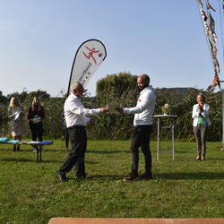 Foto: Edmund Pliefke übergab im Rahmen der Abschlussfeier ein Präsent an Mayar Pardes aus Afghanistan, der beim Boxclub Eschwege als Übungsleiter aktiv ist.