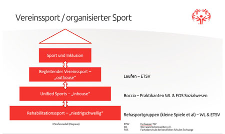 Die Heranführung von Menschen mit Handicap an den organisierten Sport kann auf mehreren Stufen erfolgen. Dabei sind alle Stufen in beide Richtungen durchlässig bzw. können übersprungen werden.
